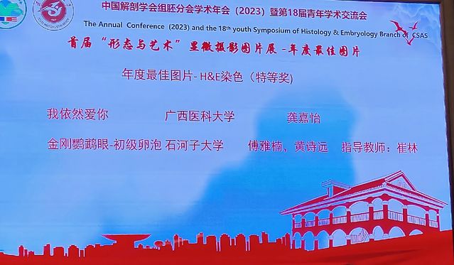 7月18日,中国解剖学会组胚分会首届“形态与艺术”显微摄影比赛、首届中国医学本科生组织胚胎学教学模型设计大赛在遵义医科大学举行。我校番茄小说 崔林老师指导的临床医学2020级傅雅楠、黄诗远同学参赛作品《金刚鹦鹉眼—初级卵泡》荣获显微摄影比赛特等奖、《中肠旋转形成模型》荣获模型设计大赛二等奖。
