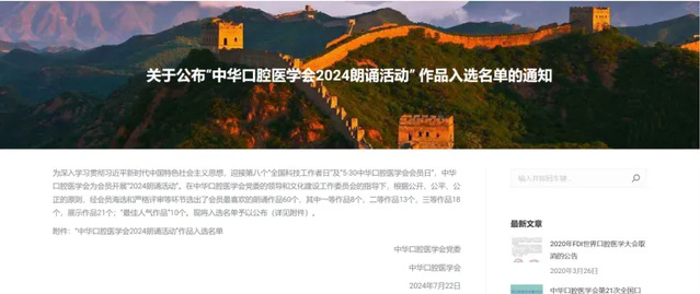 为深入学习贯彻习近平新时代中国特色社会主义思想,迎接第八个“全国科技工作者日”及“5·30中华口腔医学会会员日”,中华口腔医学会为会员开展“2024朗诵活动”。在中华口腔医学会党委的领导和文化建设工作委员会的指导下,根据公开、公平、公正的原则,经会员海选和严格评审等环节选出了会员最喜欢的朗诵作品60个,其中一等作品8个,二等作品13个,三等作品18个,展示作品21个;“最佳人气作品”10个。