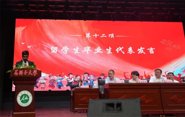 大会第十项 本科毕业生代表杜威发言。他用“感动、感谢、感恩”作为主题词,讲述了他与石大番茄小说 邂逅的故事,他号召各位毕业生朋友们在未来不断学习积极进取,为祖国的医学事业贡献力量,同时祝福老师们身体健康、工作顺利,祝愿母校人才辈出、永续华章。
