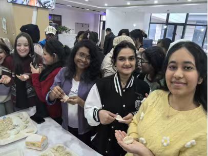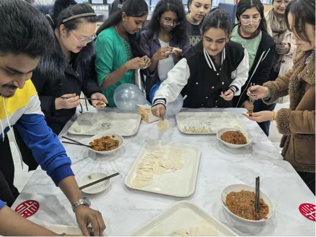 活动中,一场别开生面的包饺子环节将气氛推向高潮。饺子作为中华传统饮食文化的重要象征,承载着团圆与美好祝愿。老师们亲自上手,手把手教留学生们包饺子。从擀面皮、放馅料,到捏褶子,每一个步骤都充满了乐趣。留学生们积极参与,尽管手法有生疏又熟练,但都乐在其中。有的包出的饺子形状各异,充满创意;有的同学则包得有模有样,令人称赞。手艺稍好的同学还主动当起了“小老师”,耐心指导身边的小伙伴,在一来一往的交流互动中,大家的情谊愈发深厚。