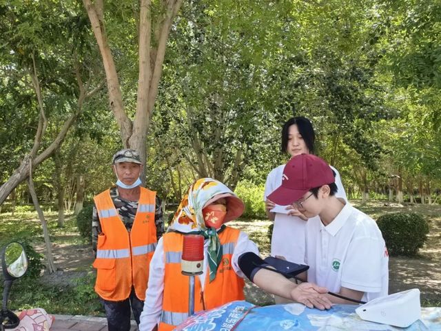 在公园长椅旁、公交站亭下,团队成员们细心为路过的爷爷奶奶们挽起衣袖,测量血压。每一次精准的读数,都伴随着耐心解读:“奶奶,您血压控制得不错,天热记得多补充水分。”“大爷,血压有点高啊,要按时按量吃药啊。” 简单的仪器承载着沉甸甸的关怀,成为守护老人健康的哨卡。