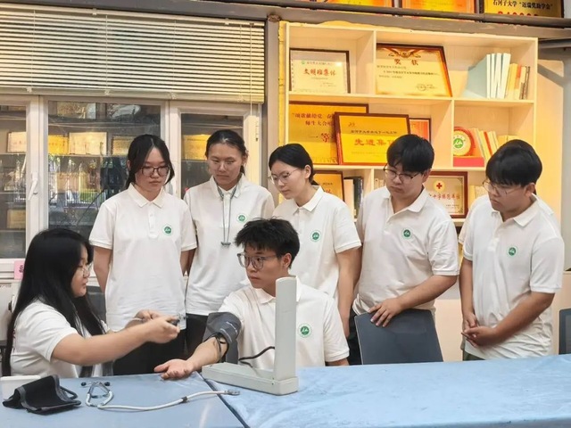 团队重点学习了心肺复苏急救法、量血压、测血糖等实用医学知识与技能。团队成员认真聆听讲解,反复操作练习,确保团队成员都熟练掌握实践项目,从而更好地为九师居民提供医疗帮助,提升居民们的健康意识和自我保健能力。