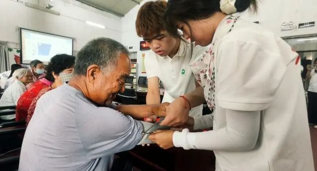 来自临床医学专业的张凯悦、伍倩、斯严慧瑜三位队员化身“健康使者”,以专业的素养和满怀关爱的心,为老人们进行健康知识讲解。