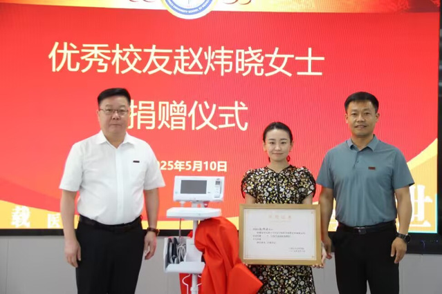 两位领导郑重将证书递交至赵炜晓手中,对其支持母校教育事业发展的善举致以崇高敬意。这份证书不仅是对捐赠义举的认可,更承载着学校与校友间深厚的情谊,见证着社会力量助力医学教育发展的温暖篇章。