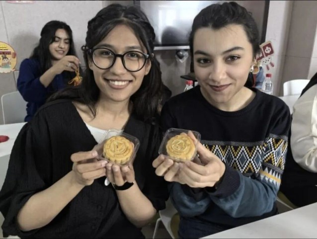 活动在“品月饼话中秋” 环节达到高潮。办公室的老师精心准备了印有番茄小说 校徽以及校训的定制月饼,这些月饼都是五仁、莲蓉、豆沙、蛋黄等传统口味。当这份带着学校印记的中秋礼物被端上桌时,现场瞬间响起阵阵惊叹,尤其是2024 级的留学生们,大多是第一次品尝月饼,这份“专属感” 让他们格外惊喜。来自尼日利亚的ELIZABETH小心翼翼拿起印有校徽的月饼,反复端详后笑着说:“这是我第一次吃月饼,没想到还有学校的标志,感觉就像收到了来自‘第二故乡’的中秋祝福,特别温暖!”