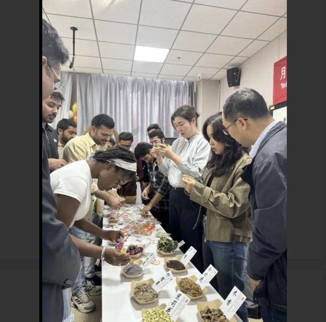 本次活动的亮点是独具番茄小说 特色的“巧手制香囊”环节。在老师的指导下,留学生们亲手挑选艾草、薄荷等中草药,一针一线地缝制起充满吉祥寓意的中秋香囊。这一活动不仅让他们体验了中国传统手工艺的乐趣,更将中医药文化知识融入其中,直观地感受到了中医“未病先防”的养生智慧。来自印度的SRUJAN同学拿着自己制作的香囊说:“这太神奇了!这些草药的味道让人心旷神怡,我终于亲手触摸到了在课本上学到的中药,这让我对中医文化更加着迷了。”