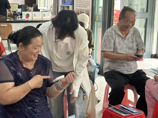 与此同时,免费的血压测量服务有序进行。实践团成员熟练操作专业设备,为每一位前来测量的居民认真检测,仔细记录数值,并依据测量结果给予个性化健康建议。对于血压偏高或偏低的居民,详细询问其日常作息、饮食习惯等信息,叮嘱他们密切关注身体状况,必要时及时就医复查。不少居民表示,以往很少关注自己血压情况,这次义诊让他们了解到自身健康状况,还学到了许多居家健康管理小妙招,收获颇丰。