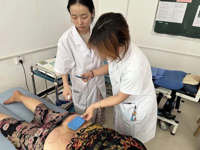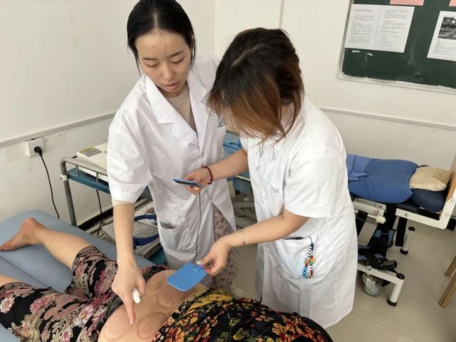 在老师指导下,队员们运用中频治疗仪,依据病人疼痛位置,细致调节透热、中频等强度参数,为患者电疗镇痛,在现代中医理疗实践里打磨技能。