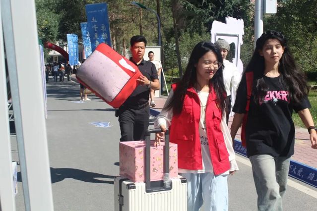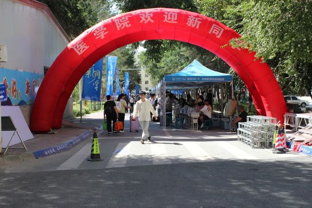 路上的迎新标志藏着巧思:路灯杆上挂着“欢迎新同学”的彩带,转角处立着各学院的卡通形象立牌,地面的箭头贴纸印着“报道这边走”“社团在前方”。连路边的标语都带着温度——“从这里开始,让医学梦想发芽”“新的旅程,等你出发”,一步一景,都在悄悄说“欢迎回家”。