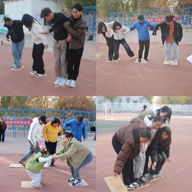与此同时,8字跳绳项目中师生身姿轻盈,如游鱼穿梭,展现出良好的节奏感与团队配合;踩板子过河则考验选手的平衡与策略,两人一组的趣味协作引发阵阵欢笑;抢凳子项目在紧张欢快的音乐中进行,师生们反应敏捷、你争我抢,现场充满轻松活泼的竞技乐趣。