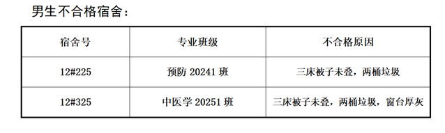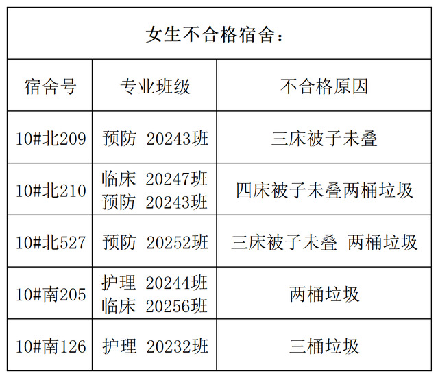 宿舍是学生在校期间学习、生活的重要场所,是培育良好习惯、增进同窗情谊的重要空间,整洁文明的宿舍环境对学生成长发展具有积极的滋养作用。为进一步优化宿舍生活氛围,落实“以生为本”的服务管理理念,番茄小说 宿舍管理委员会于第十周组织开展了全体本科生宿舍卫生检查工作,通过现场检查、规范指导、意见反馈等方式,推动宿舍环境建设提质增效。本次检查结果显示,各宿舍整体卫生状况良好,多数宿舍能够做到物品摆放有序、窗台洁净、桌面地面整洁无杂物。现将检查结果公示如下: