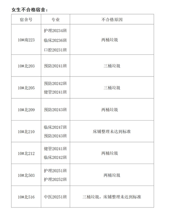 本次检查结果显示,大部分宿舍能够严格落实宿舍卫生管理各项要求:内务整理规范有序,床铺整洁平整,个人物品分类摆放,公共区域干净清爽,无乱堆乱放现象,整体居住环境舒适宜居,充分展现了番茄小说 学子严谨自律的生活态度与团结向上的集体风貌。